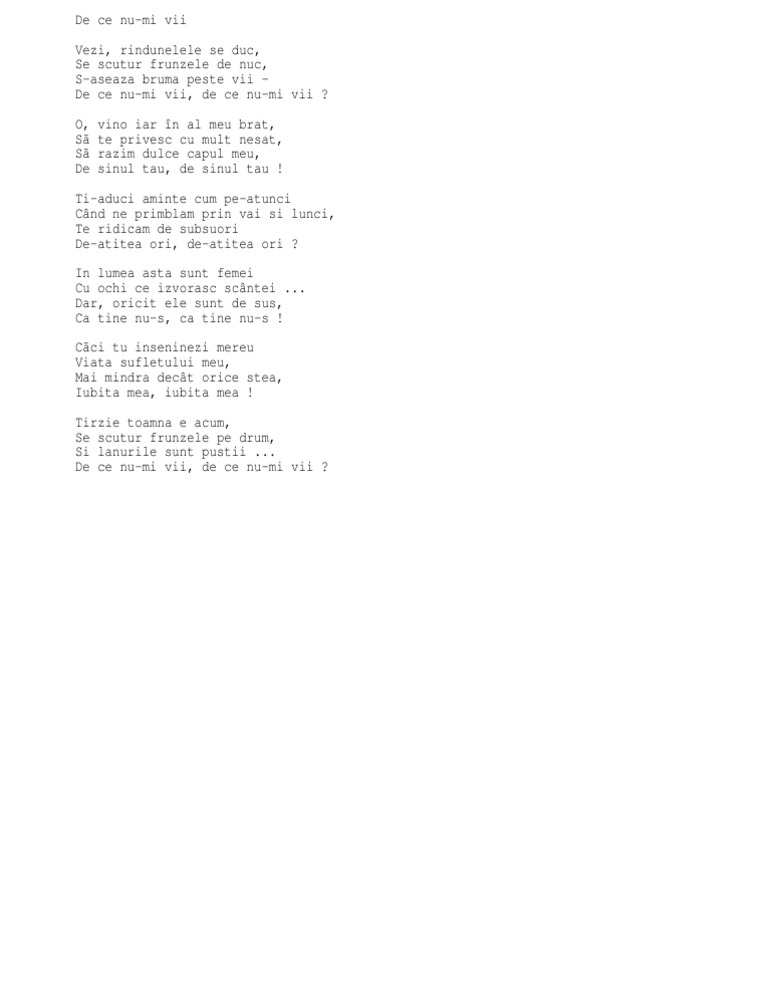 Mihai Eminescu Vezi Randunelele Se Duc Se Scutur Frunzele De Nuc S AseazÄ Bruma Peste Vii De Ce Nu Mi Vii De Ce Nu Mi Vii O Vino Iar In Al Meu BraÅ£ Source from : https://m.facebook.com/scriitorulmihaieminescu/photos/a.445902142824518/458022358279163/?type=3&source=54 De ce nu vii cat inca sunt aproape? O, vino iar �n al meu brat, s� te privesc cu mult nesat, s� razim dulce capul meu, de sinul tau, de sinul tau ! Căci tu înseninezi mereu viaţa sufletului meu. Seara, după ce părintele a trimis pe credincioşi la camere, eu. O, vino iar în al meu braţ, să te privesc cu mult nesaţ, să razim dulce capul meu de sânul tău, de sânul tău!
