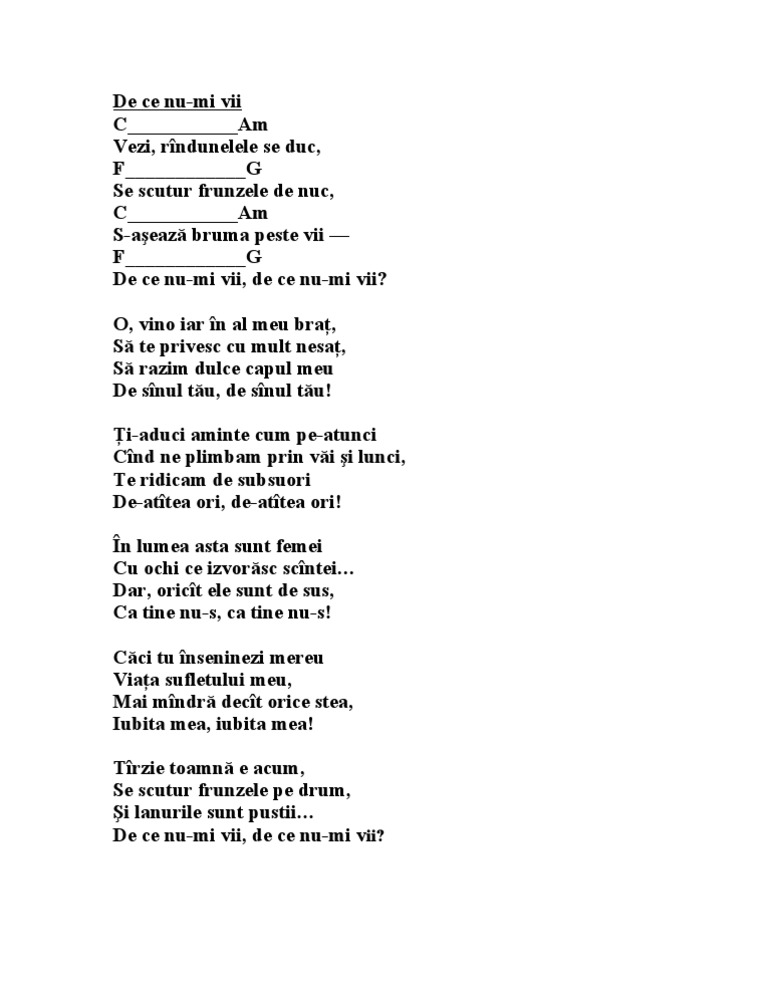 C de ce nu vii? O, vino iar în al meu braţ, să te privesc cu mult nesaţ, să razim dulce capul meu de sânul. Read de ce nu vii? O, vino iar în al meu braț, să te privesc cu mult nesaț, să razim dulce capul meu de sînul tău, de sînul tău! De ce nu simti lumina mea pe pleoape si harul meu, in ceasul tau suprem?