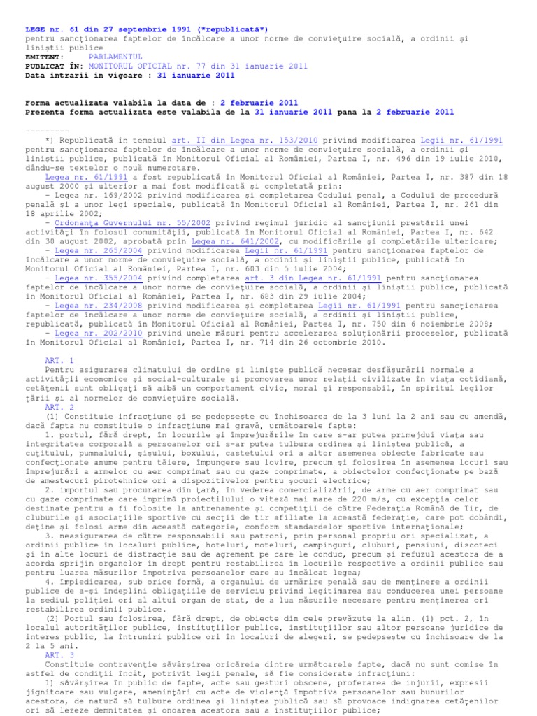 vizitati articolul complet aici : https://commons.wikimedia.org/wiki/File:Monitorul_Oficial_al_Rom%C3%A2niei._Partea_I_1991-03-23,_nr._61.pdf Legea 61/1991 republicata pentru sanctionarea faptelor de incalcare a unor norme de convietuire sociala, a ordinii si linistii publice. 61/1991 pentru sancţionarea faptelor de încălcare a unor norme de convieţuire socială, a ordinii şi liniştii publice. 153/2010 privind modificarea şi completarea legii nr.